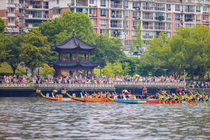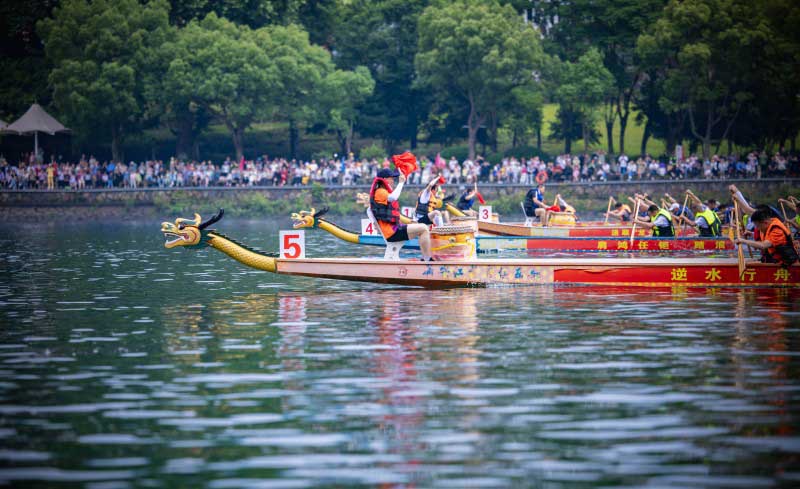 随着一声令下,四支龙舟如离弦之箭破浪而出,江面上水花飞溅,龙首劈波斩浪,各队你追我赶,难分伯仲,阵阵鼓声与“加油”声浪此起彼伏。